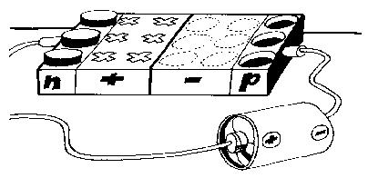 Now the electrons from the battery pushes the free electrons of the n-material. Then they move towards the positive holes and they are attracted by the positive side of the battery.